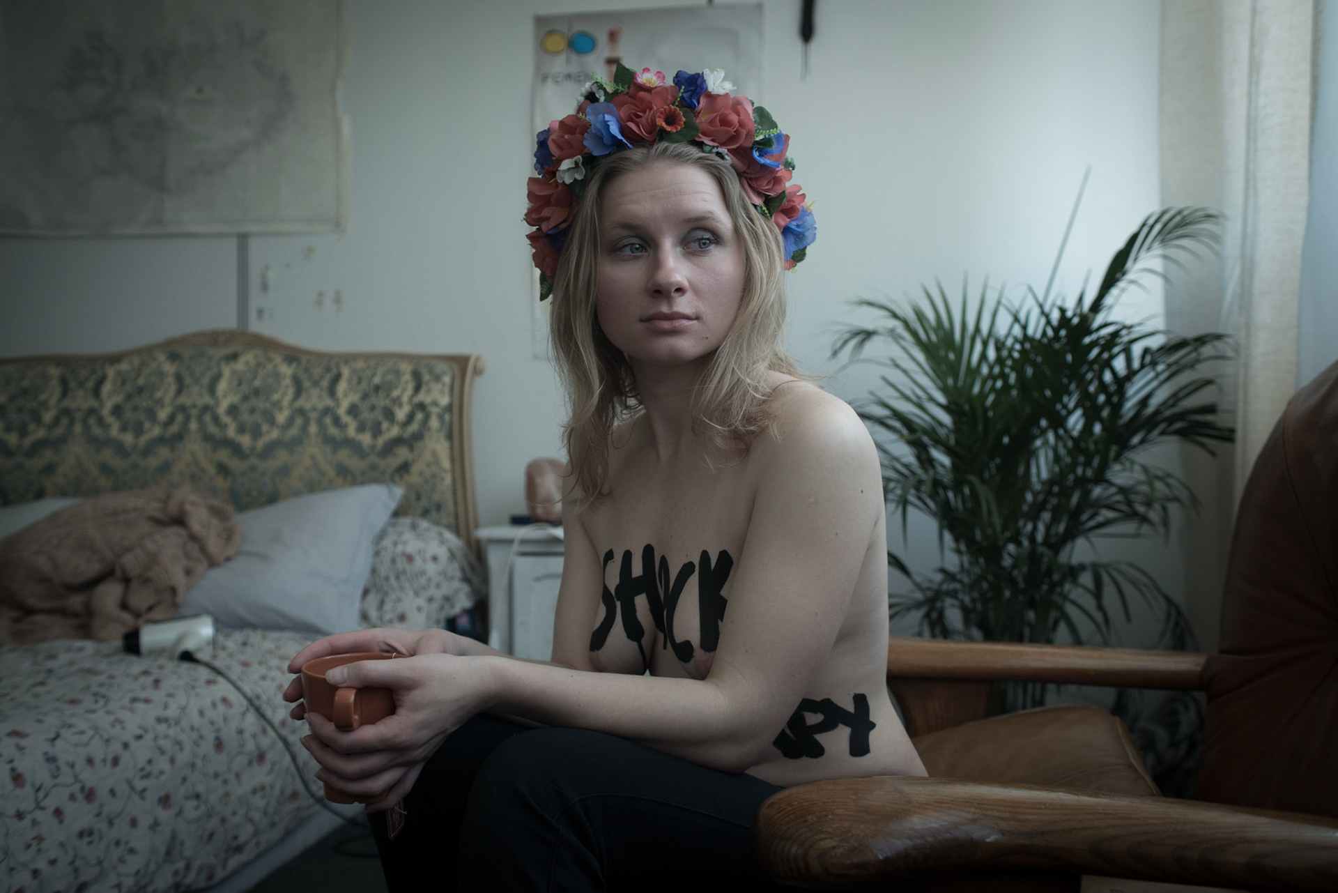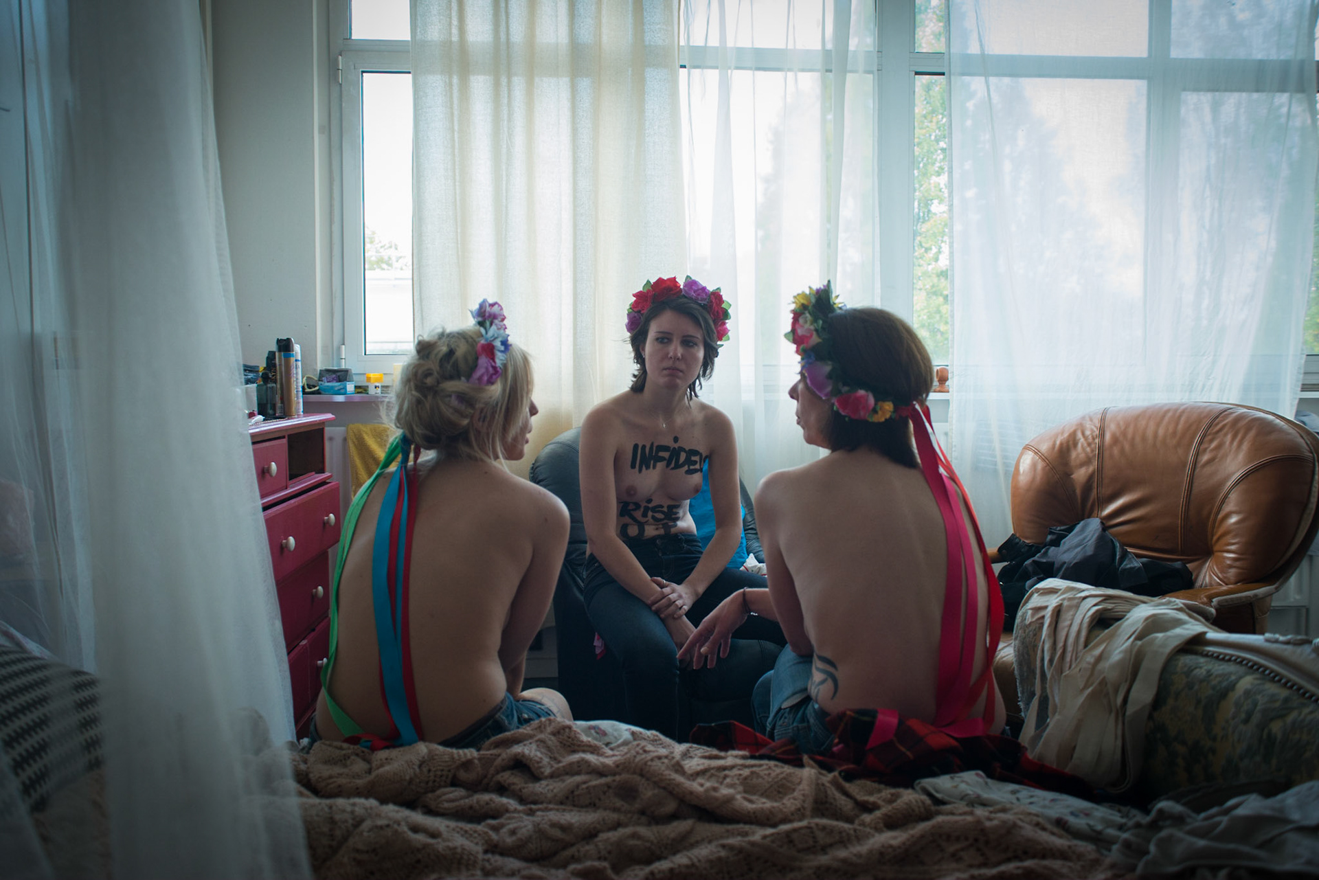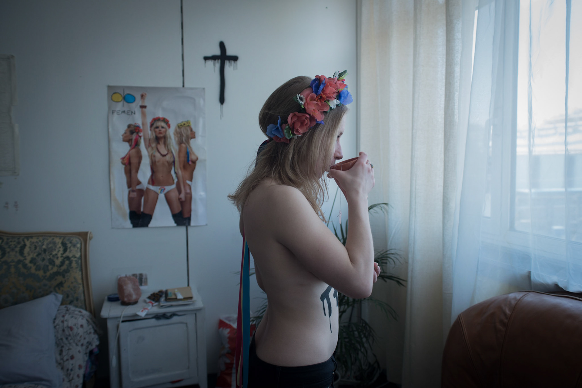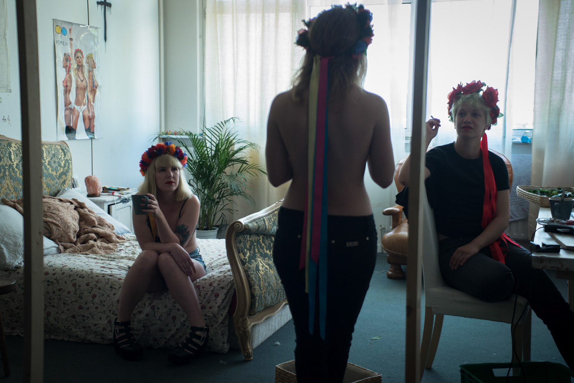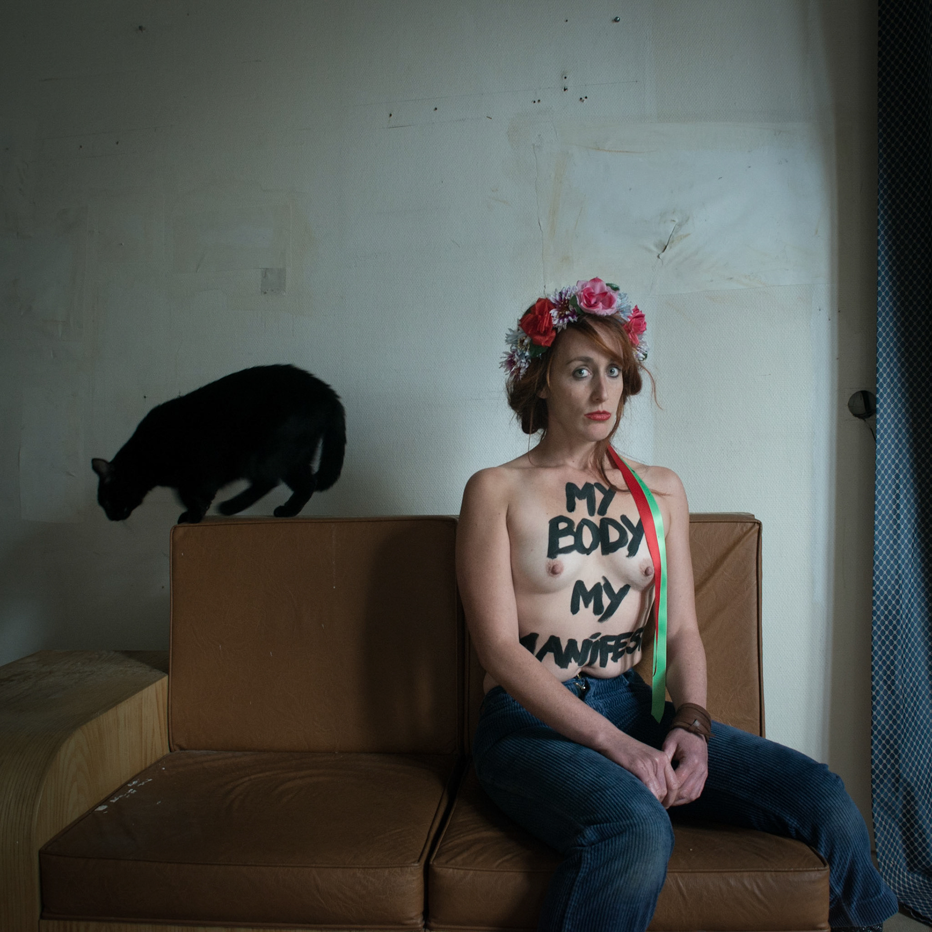 En 2014 et 2015, j’ai réalisé des images des FEMEN dans leur QG, des portraits, des détails, mais aussi des scènes de préparation et de repos …