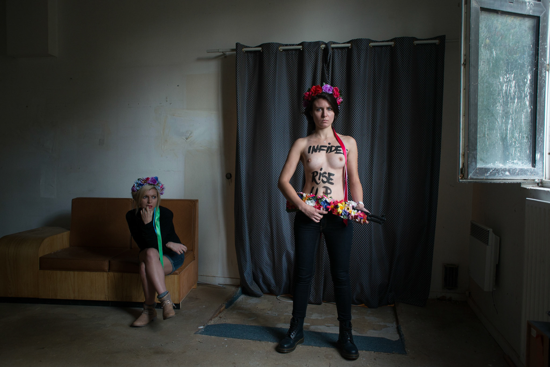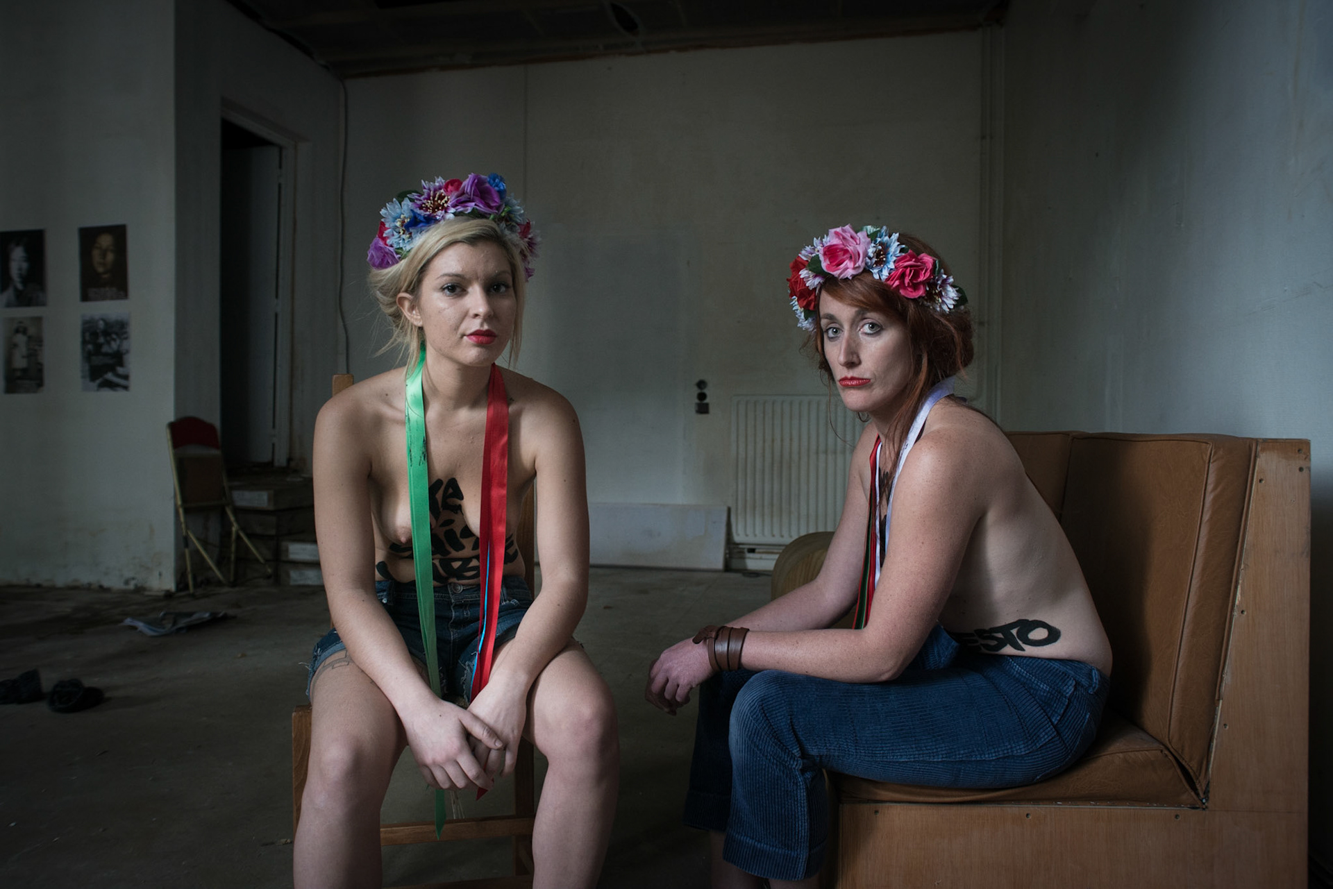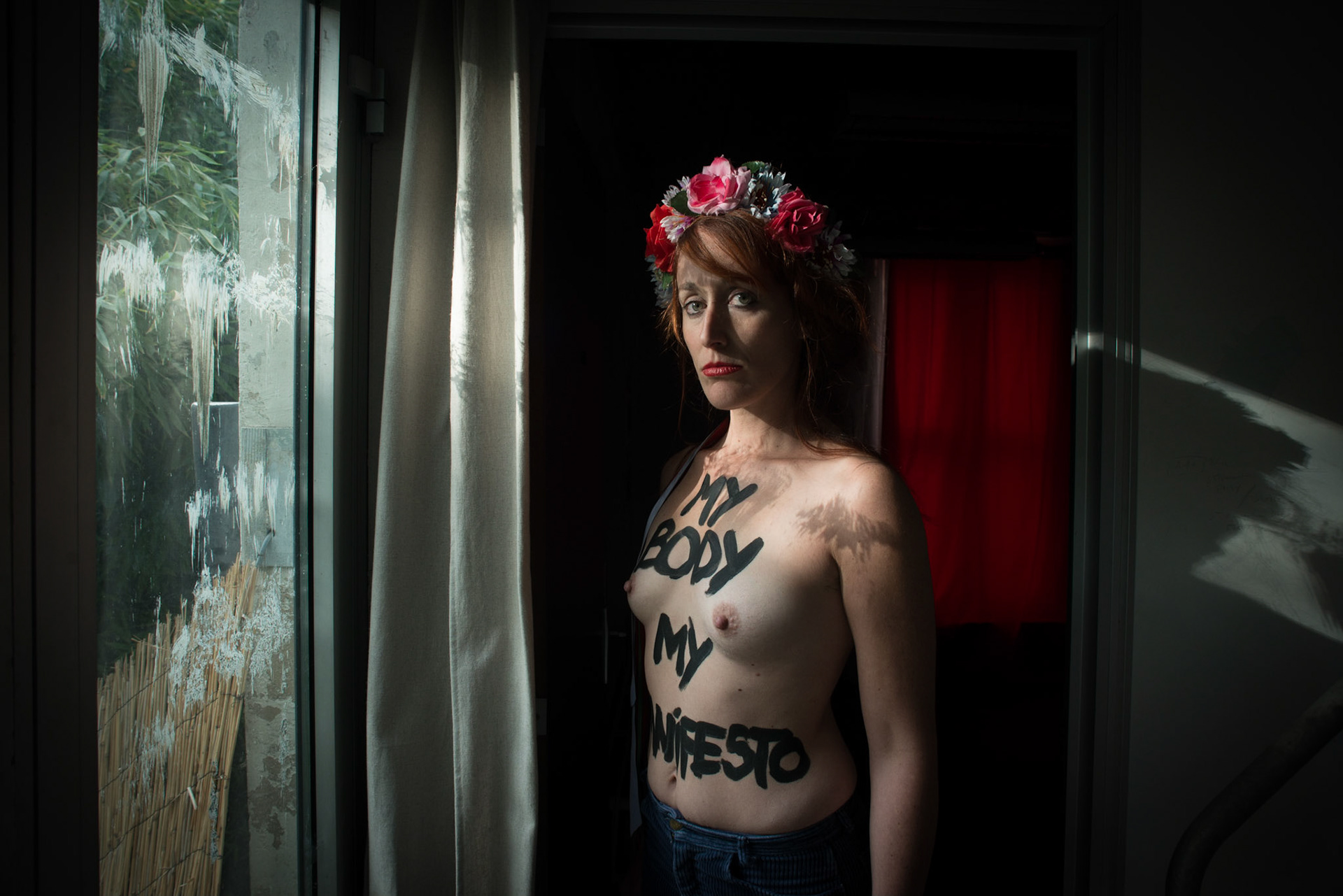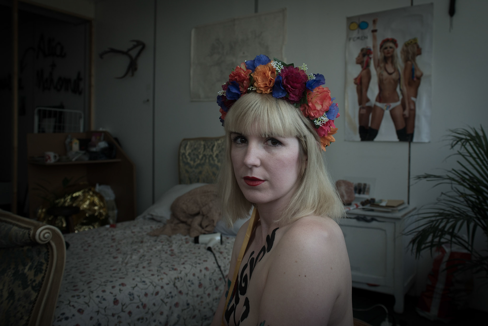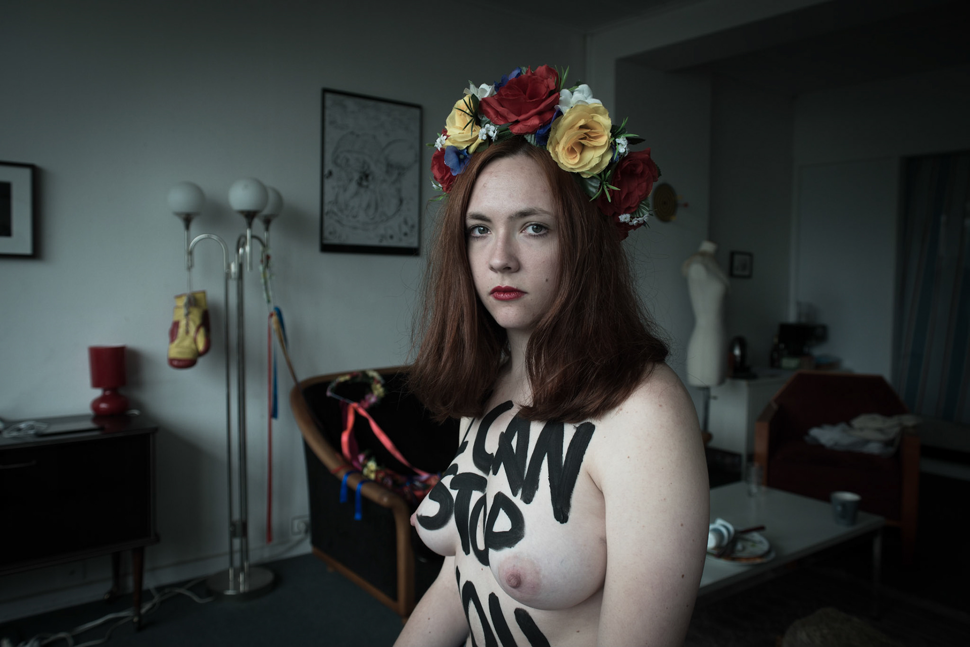 En 2014 et 2015, j’ai réalisé des images des FEMEN dans leur QG, des portraits, des détails, mais aussi des scènes de préparation et de repos …