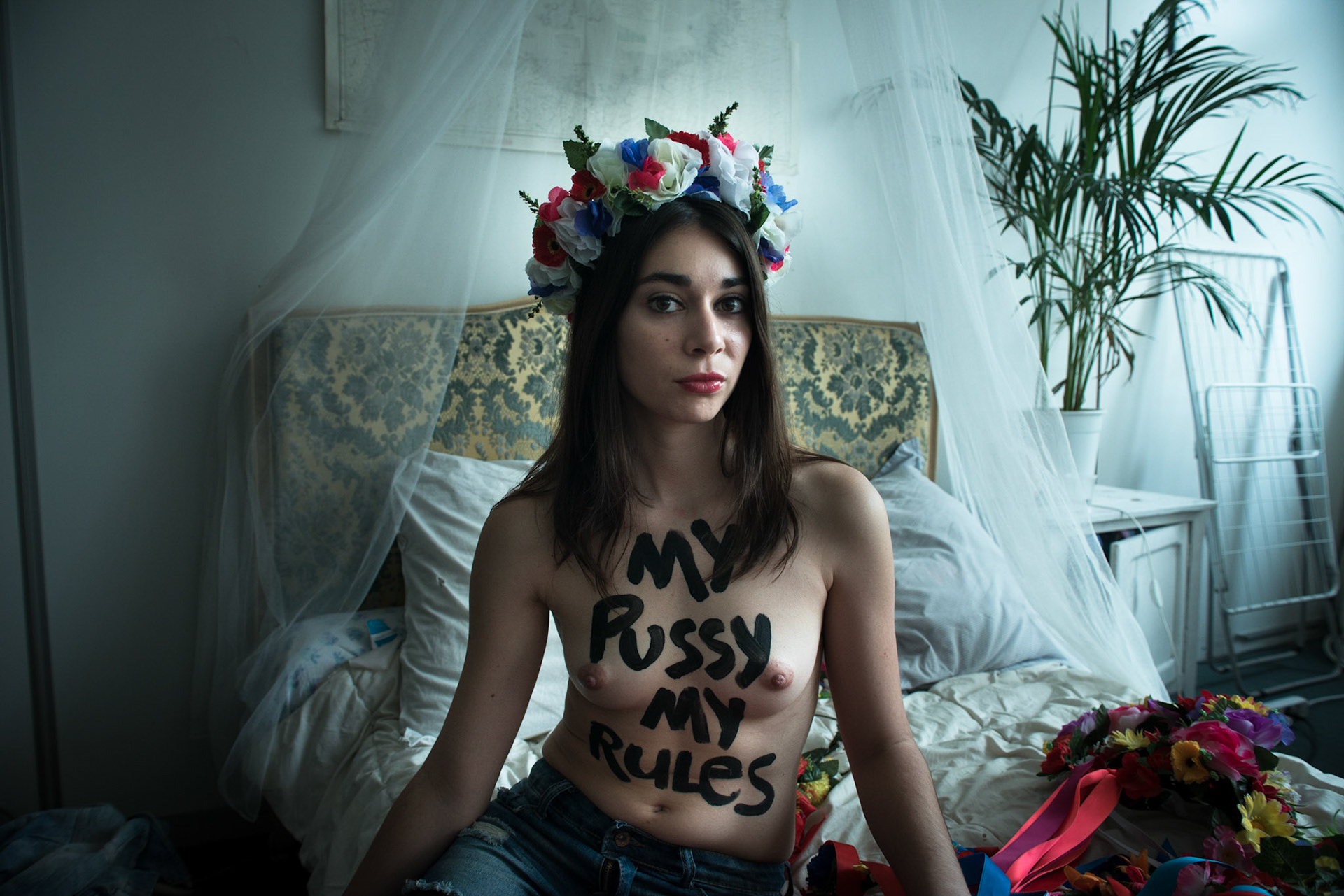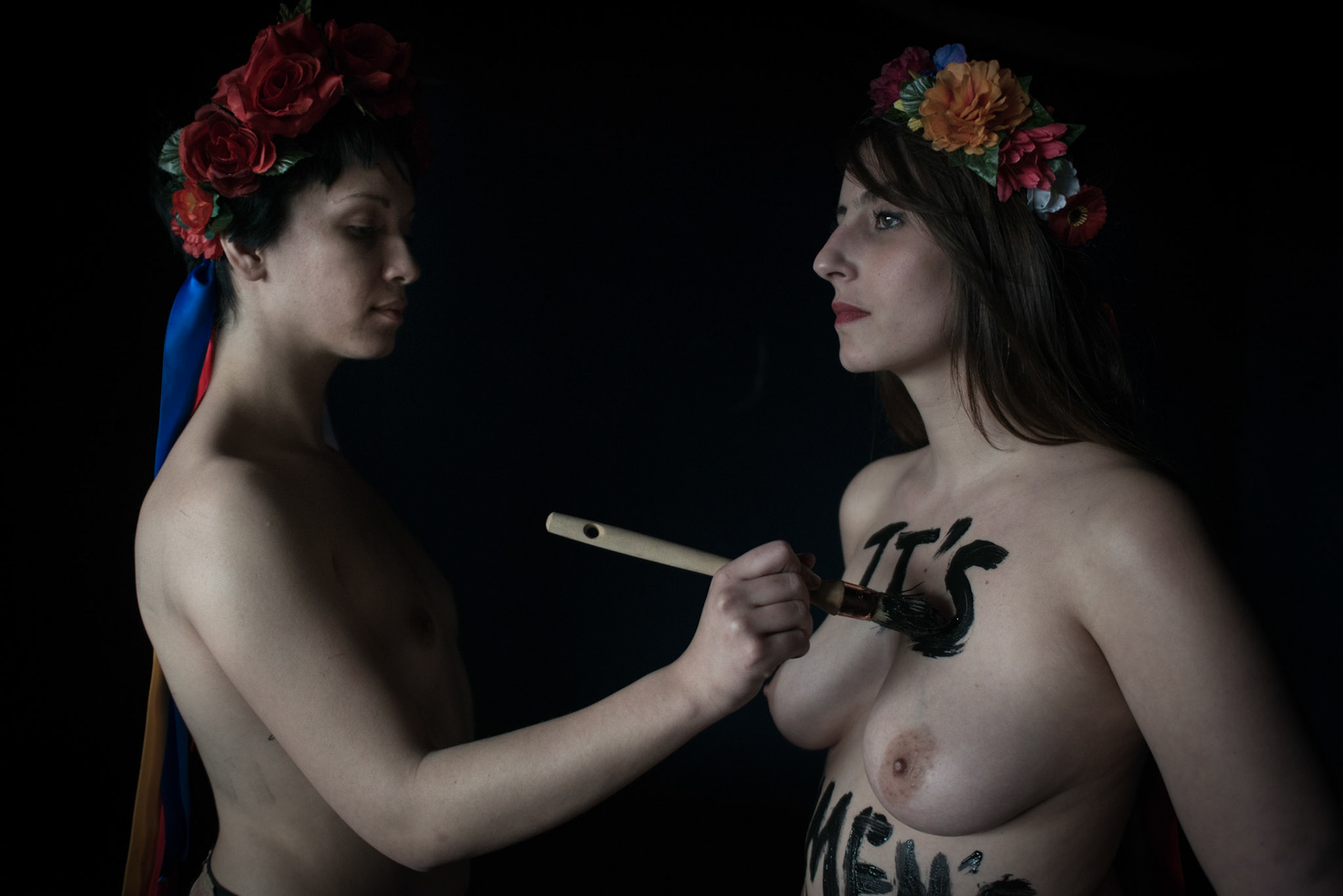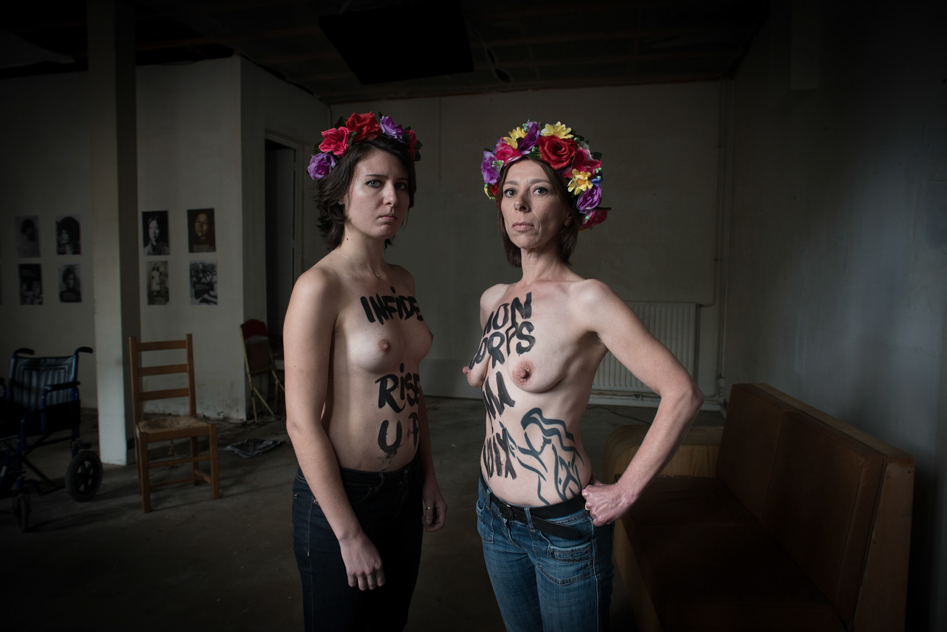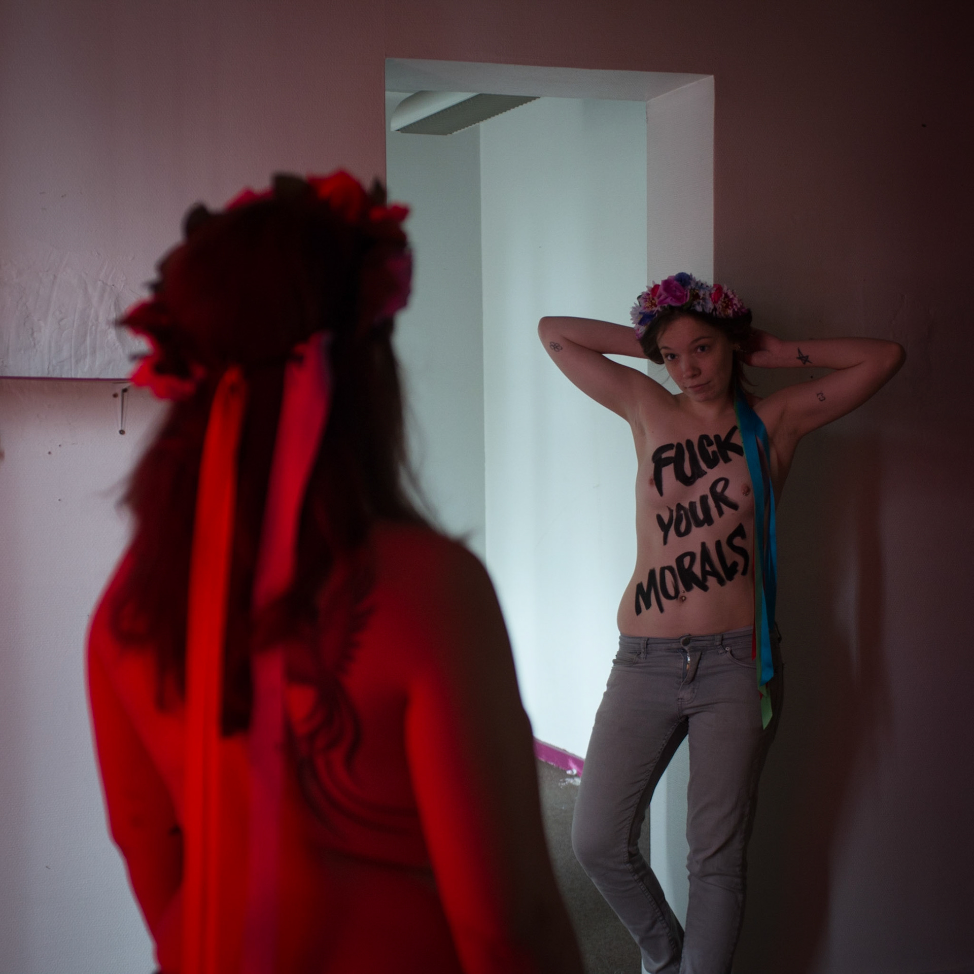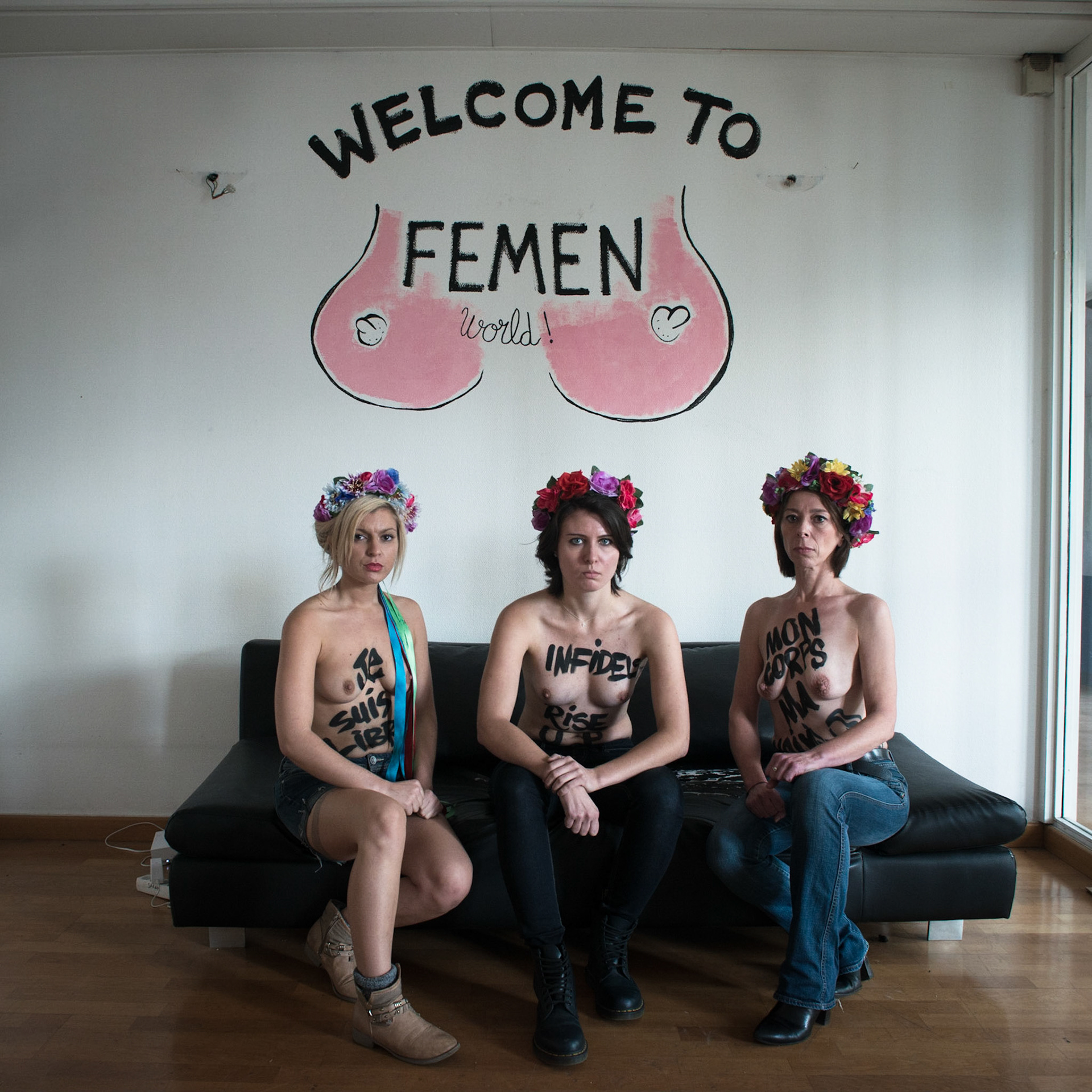 En 2014 et 2015, j’ai réalisé des images des FEMEN dans leur QG, des portraits, des détails, mais aussi des scènes de préparation et de repos …