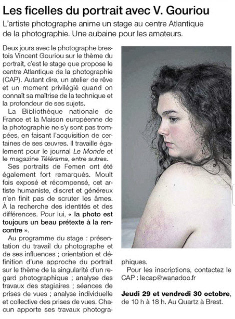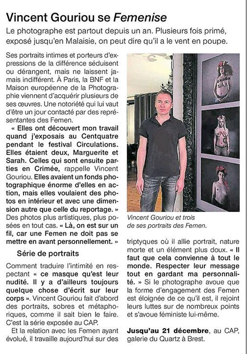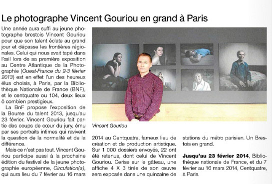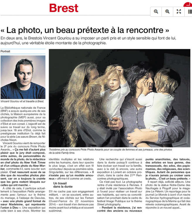 « Le Brestois Vincent Gouriou présente ses images tendres de l’humanité qu’il croise près de chez lui. Couples mono parentaux, transsexuels, une jeune fille ronde qui semble caressée par le pinceau d’un peintre, un enfant enfermé dans une gaine et pourtant impassible. Ce photographe, attiré par la marge, parle de la douleur, avec comme prisme, sa profonde douceur. On est frappé par sa maîtrise du numérique et de la lumière. Gouriou ira loin, d’ailleurs, non: il est déjà loin. »