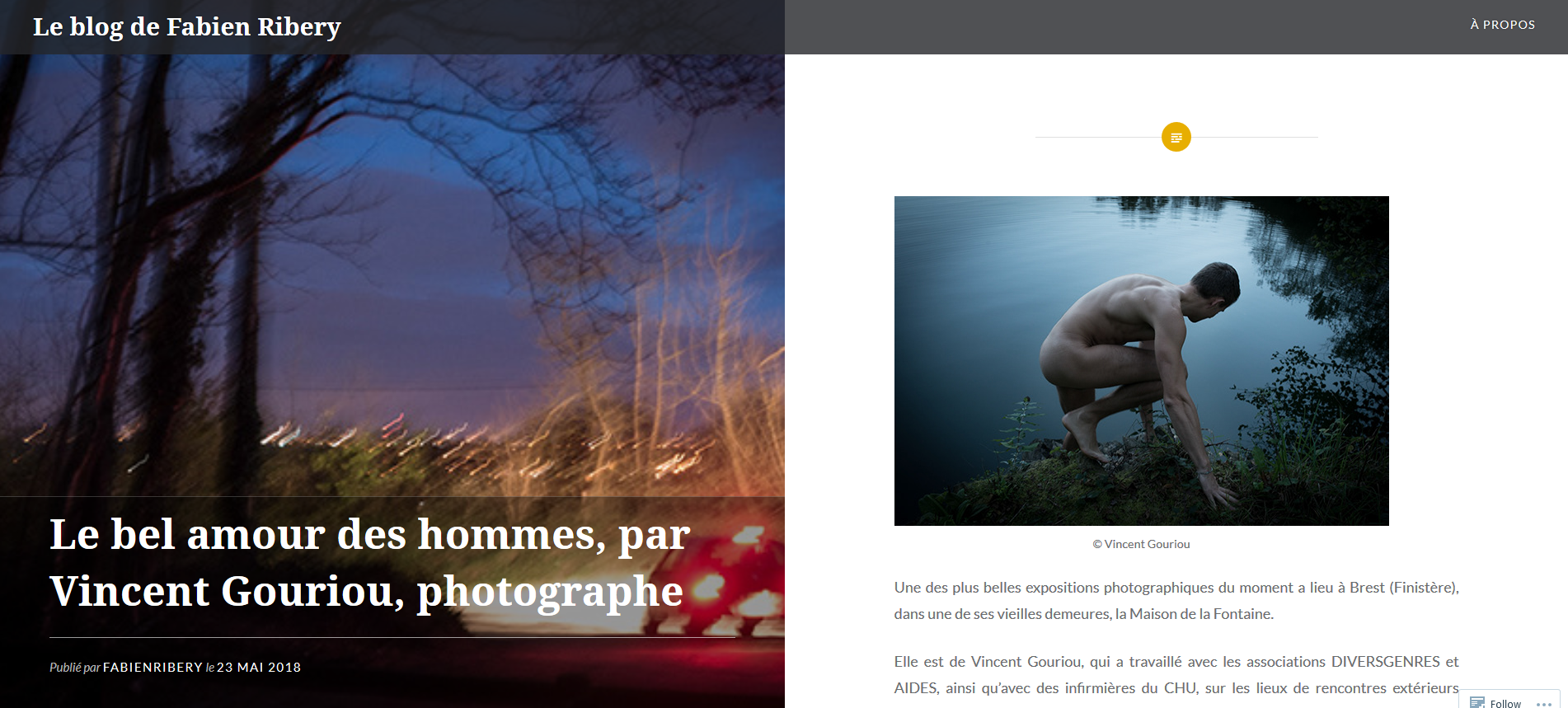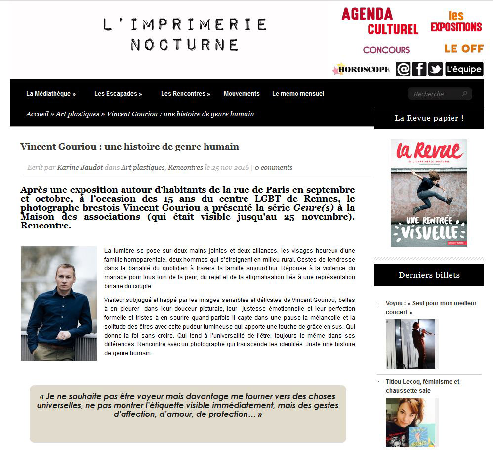 « Parmi eux, les séries de Vincent Gouriou, qui approche familles homoparentales, sexualité et transgenre en milieu rural (avec le Centre atlantique de la photographie à Brest) ou les lutteurs au crépuscule de Nolwenn Brod (avec la galerie Le Lieu à Lorient). »